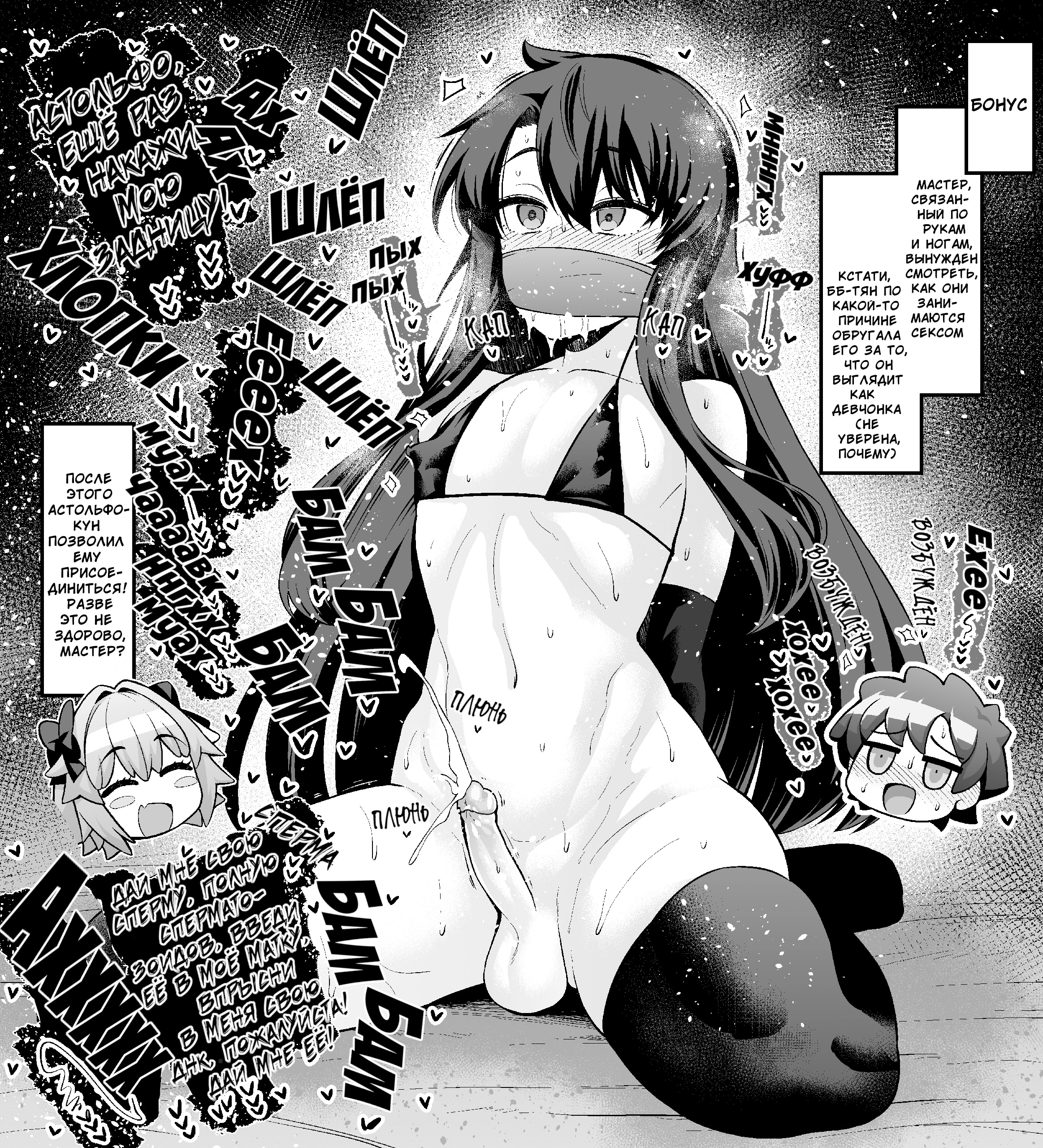 После череды неожиданных поворотов Мастер оказывается запертым «в одиночестве» в комнате, откуда он может выбраться, только занимаясь сексом! Но Бб-тян добрая! В качестве облегчения он может выбраться, наблюдая за другими, занимающимися сексом! Смогут ли Астольфо и остальные спасти Мастера?! В этом году в Японии год Кролика, поэтому, конечно же, я не мог это не нарисовать!